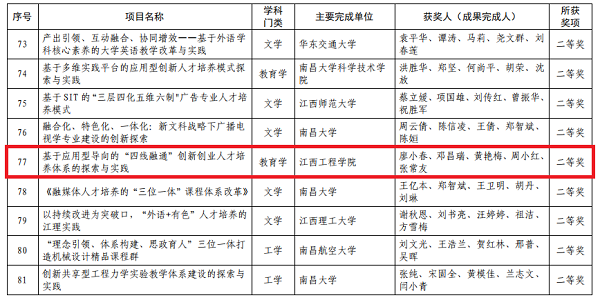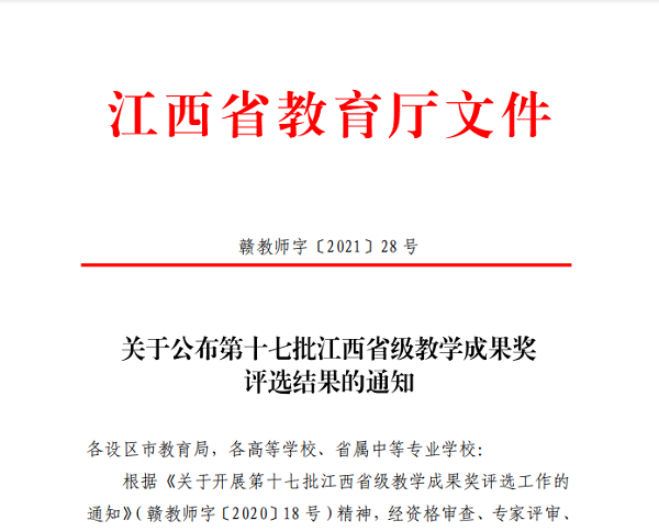 日前,江西省教育厅印发《关于公布第十七批江西省级教学成果奖评选结果的通知》(赣教师字〔2021〕28号),beat365廖小春等人申报的《基于应用型导向的“四线融通”创新创业人才培养体系的探索与实践》项目获得省级教学成果奖高等教育(本科层次)二等奖。