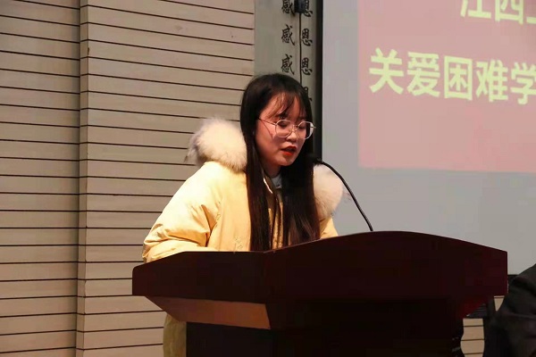 数字贸易学院2021级电子商务本科3班的叶周易和智能与能源工程学院2020级新能源科学与工程本科1班的姚梦珂代表受助学生发言,感谢学校为贫困学生送温暖,让他们在这个寒冷的冬天里,感受到学校对困难学子的关心关爱,也更加坚定了他们发奋学习、努力完成学业的信心。