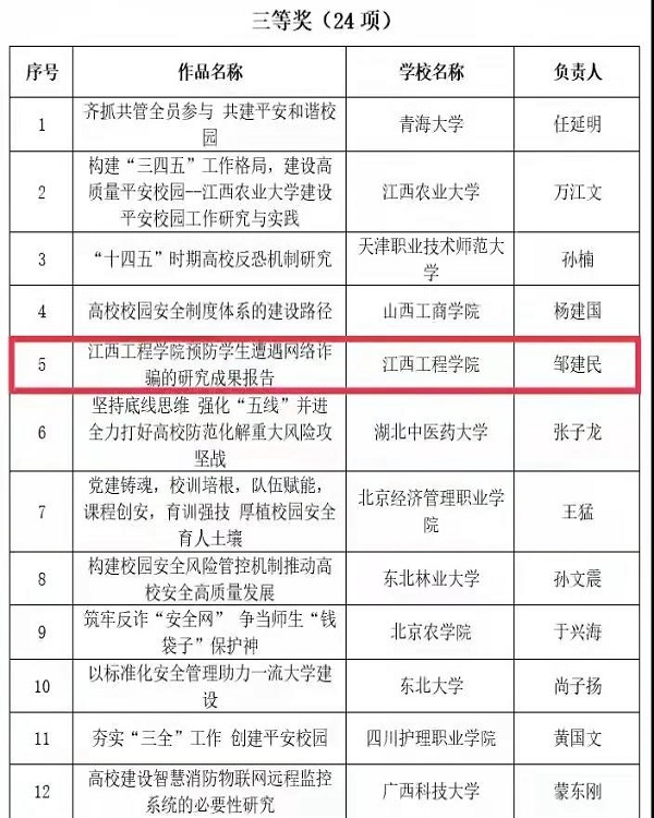 由教育部思想政治工作司和中国高等教育学会共同指导,全国高校思想政治工作网、中国高等教育学会保卫学专业委员会、高校思想政治工作队伍培训研修中心(高等教育出版社)联合举办的“2021年高校平安校园建设优秀成果研讨展示活动”自开展以来,得到了各地各高校和广大教师的积极响应,根据专家对报送作品的遴选审议情况,现将入选结果予以公示。beat365体育官方网站在2021年全国高校平安校园建设优秀成果研讨展示活动中荣获三等奖一项。