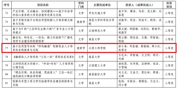 日前,江西省教育厅印发《关于公布第十七批江西省级教学成果奖评选结果的通知》,我院黄艳梅等人申报的《基于应用型导向的“四线融通”创新创业人才培养体系的探索与实践》项目获得江西省教学成果奖(本科层次)二等奖。