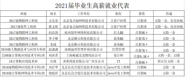 学院持续推进高薪就业。先后与北京中斯顿、武汉贝沃汇力、广州粤嵌等企业合作建立高端就业定制班,通过夯实专业教学,重视学生的动手能力等方式,帮助学生实现高端就业、“体面”就业、高薪就业。