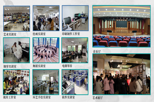 学院拥有独立的教学大楼,建筑面积2.5万平方米,配备了文创创客实训室、数字影像实训室、装饰照明实训室、模型制作实训室、艺术作品展览厅、演艺厅、原声音乐厅、电钢琴房、钢琴房、舞蹈房、名家工作室、专业画室等共20类68间实践实训室,为实践教学提供了有力保障。