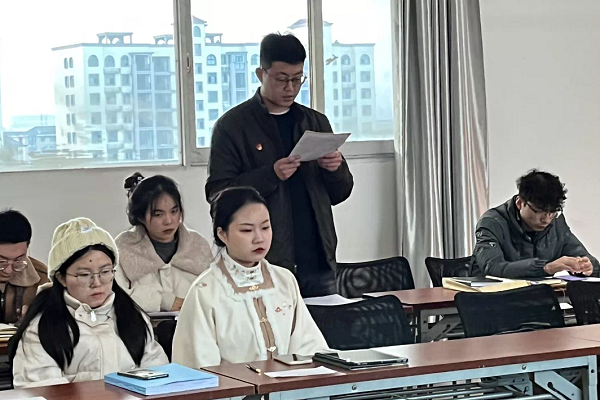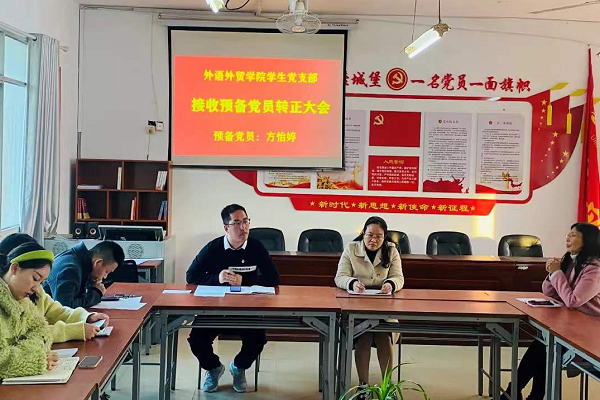 2、为进一步扩大党员队伍,增强党员队伍生机与活力,不断为党输送新鲜血液,2021年12月20日,外语外贸学院学生党支部召开预备党员转正大会。本次会议由外语外贸学院学生党支部书记傅煜平主持,党总支书记车婧,党总支副书记王雄和全体党员参加。