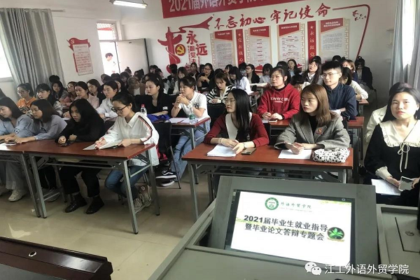 37、为统筹做好毕业生就业指导工作和毕业答辩工作,确保毕业生顺利就业、毕业,外语外贸学院于2021年5月20日下午1:30在C601召开2021届毕业生就业指导暨毕业论文答辩专题会,外语外贸学院党总支书记、院长车婧,副院长吴礼明,党总支副书记王雄,专业教师圣仰芝教授,各位答辩指导老师以及2021届本科毕业生参加本次大会。