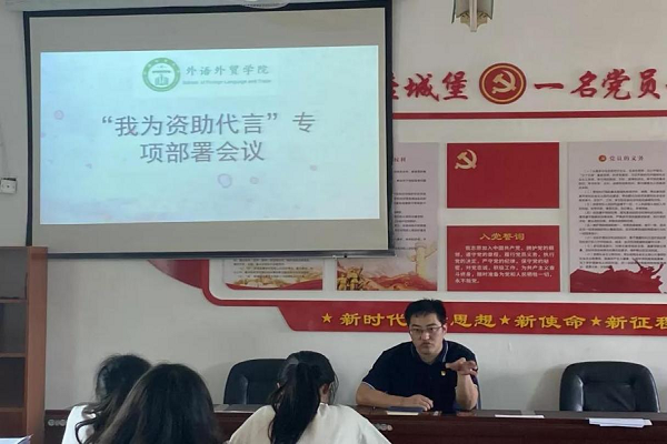 18、为进一步深入贯彻习近平新时代中国特色社会主义思想和全国教育大会精神,落实教育部《关于做好疫情防控期间学生资助工作的通知》的要求,外语外贸学院在c601教室开展“我为资助代言”专项部署会议。