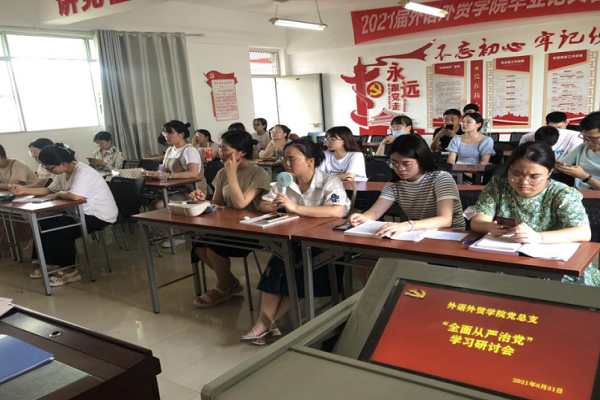 23、2021年8月31日,外语外贸学院党总支于C栋601党员活动室召开全面从严治党学习研讨会,本次会议由外语外贸学院党总支书记车婧主持,党总支副书记王雄、副院长吴礼明以及全体党员教师参加本次会议。