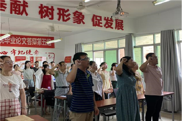 27、2021年6月17日,外语外贸学院组织党员教师在C601党员活动室开展了“不忘初心担使命,党旗面前践承诺”活动,各位党员老师在鲜红的党旗下,举起右拳,坚定响亮地重温了入党誓词。