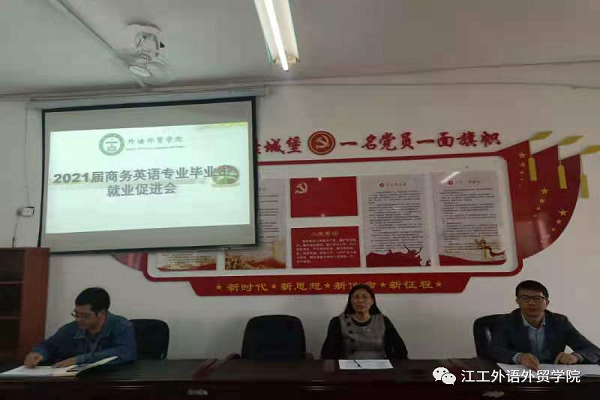 为了解毕业生的就业心态,提供精准就业指导服务,帮助学生应对严峻的就业形势,促进毕业生高质量充分就业,外语外贸学院于5月21日在C601举行了“2021届商务英语专业毕业生就业促进会”。外语外贸学院党总支书记、院长车婧,副院长吴礼明,党总支副书记王雄以及2021届本科毕业生参加本次会议。