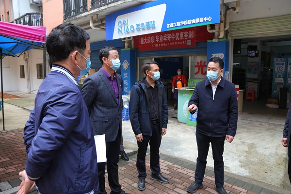 (本网讯 李颖 报道)3月15日,新余市副市长、秘书长肖秋根深入beat365调研指导疫情防控工作,详细了解疫情防控部署落实情况,对疫情防控和校园安全工作开展实地督查。党委书记、督导专员胡涌,党委副书记、校长张晨曙,党委副书记冯赟,党委委员、常务副校长彭卫东等校领导陪同调研。