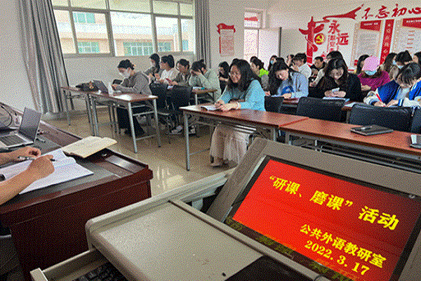 2022年3月19日与26日,公外教研室集中进行磨课。由于我部任课教师较多,故磨课分两组进行,第一组评议员为刘业胜(公共外语教学部副主任)、陶芸燕(学院教学督导员),磨课教师有曾鹏霞、裴莹、温志成、张丽红、金锐、胡金、张莉、陈好、李惠娟、向颖、钟雯;第二组评议员为邹伊勤(公外教研室主任)、吴函(学院教学督导员),磨课教师有周明霞、陈润轩、彭琪、傅煜平、钟传根、夏娟、范智宏、徐荔、许青云、刘景瑜、熊伟、黄娜。