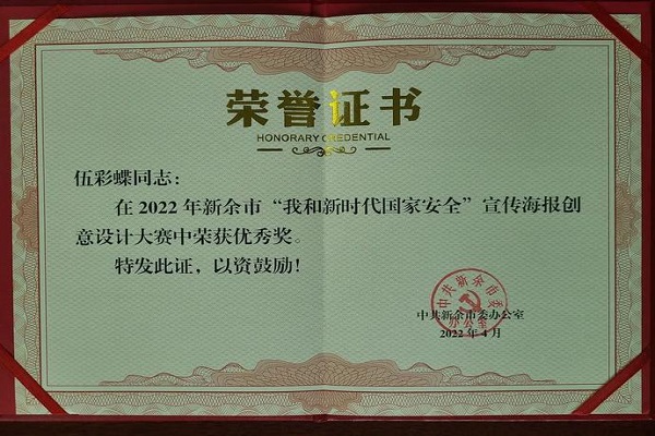 beat365数字贸易学院收到上级通知后,积极组织学生参加大赛活动。在宣传海报比赛项目中,beat365数字贸易学院20级网络与新媒体本科1班学子伍彩蝶的作品《第七个全民国家安全教育日》荣获优秀奖。