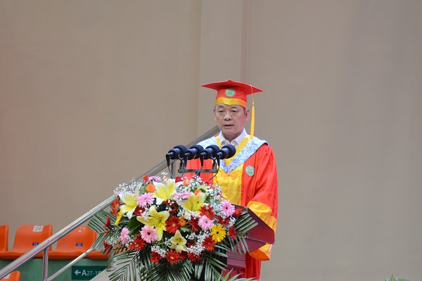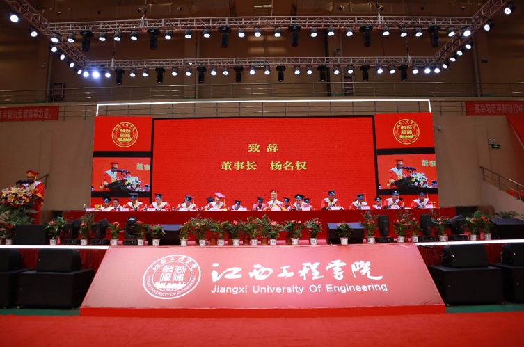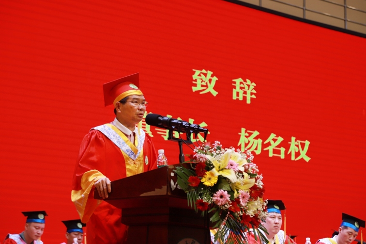 董事长杨名权代表学校董事会,向圆满完成学业、即将开启新的人生旅程的同学们,表示最热烈的祝贺!他表示,最让他高兴的是你们收获了学业上的丰硕成果;最让他欣慰的是你们强化了担当精神和责任意识;最让他感动的是你们对母校、老师和同学的那份真挚情感。他希望每一位毕业生,对学校要有一个正确的认识评价,要看到学校的成绩,要看到学校发展的主流,学校成绩是主要的,对国家对社会贡献是主要的。树立校兴我荣,校衰我耻,母校的形象就是我们的形象的意识。
