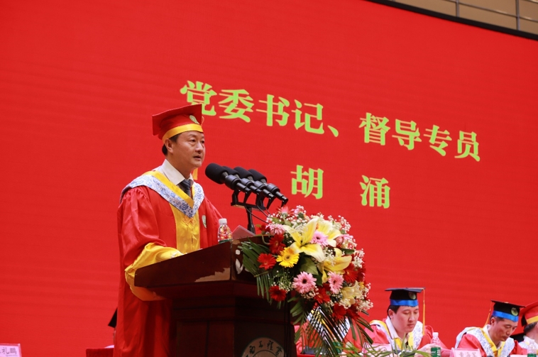 胡涌书记为毕业生们提出四点殷切希望:一是青春向未来,用脚步丈量祖国大地。二是青春向未来,用眼睛发现中国精神。三是青春向未来,用耳朵倾听人民呼声。四是青春向未来,用内心感应时代脉搏。
