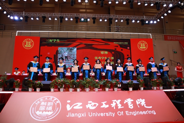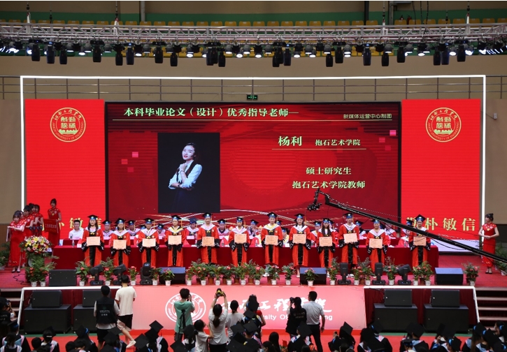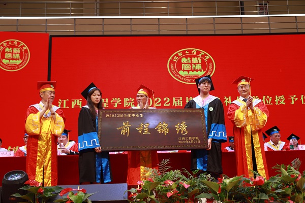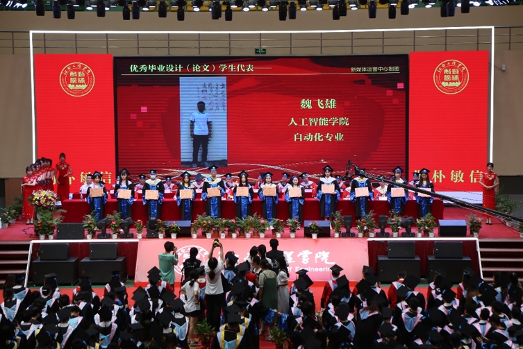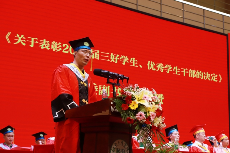 党委副书记冯赟在典礼上宣读《关于表彰2022届三好学生、优秀学生干部的决定》。在主席台就座的校领导为获表彰者颁奖。