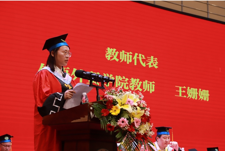 外语外贸学院教师代表王姗姗发言,她向毕业生们分享自己的人生感悟即“耐心、信心、感恩之心”!希望同学们今后能坚守一颗平常心,真诚地对待他人,热忱地对待工作,坚韧地对待困难,乐观地对待生活!最后衷心祝愿同学们在新的道路上前程似锦、梦想成真、平安快乐!