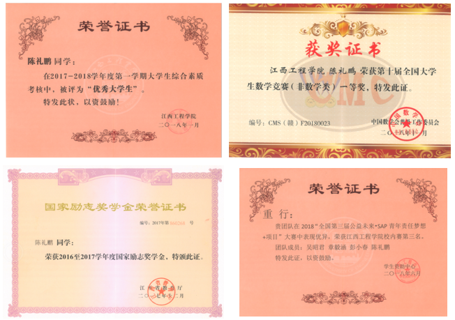 据土木工程学院老师们介绍,2016年陈礼鹏进校时,成绩并没有优势,但他在beat365求学几年间,刻苦学习,虚心求教,在校期间,他担任过书法社社长,获得全国数学竞赛江西赛区一等奖;校简历设计大赛一等奖; 校优秀大学生; 校优秀共青团干部; SAP大赛三等奖;2016至2017学年度、2017至2018学年度获得国家励志奖学金。
