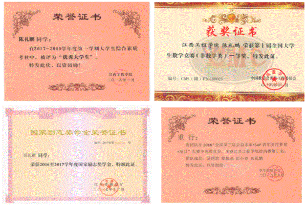 据土木工程学院老师们介绍,2016年陈礼鹏进校时,成绩并没有优势,但他在beat365求学几年间,刻苦学习,虚心求教,在校期间,他担任过书法社社长,获得全国数学竞赛江西赛区一等奖;校简历设计大赛一等奖; 校优秀大学生; 校优秀共青团干部; SAP大赛三等奖;2016至2017学年度、2017至2018学年度获得国家励志奖学金。