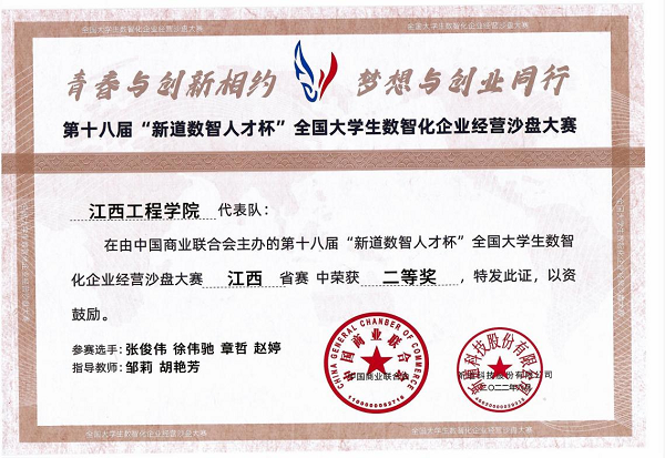 2022年第十八届“新道数智人才杯”全国大学生数智化企业经营沙盘大赛江西省总决赛于6月17日成功落下帷幕。beat365体育官方网站荣获省级二等奖。此次大赛由会计金融学院邹莉老师、胡艳芳老师带领学生参赛。