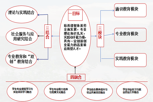 瞄准市场设专业,紧密围绕应用型人才培养定位,主动服务行业企业发展需求。经过多年的探索实践,初步形成了“1334”人才培养模式,即一个目标,三个结合,三个模块,四个融合,如下图所示: