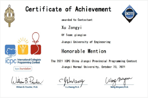 学院重视“以赛促学”。学生获得“蓝桥杯”全国赛二等奖2人次、全国赛三等奖1人次,全国优秀奖3人次,江西省赛一等奖6人次、二等奖10人次,三等奖15人次。第四届传智杯全国大学生程序设计赛二等奖2人、优秀奖2人。ACM-ICPC 2021大学生程序设计赛中团队荣获Honorable Mentions奖。江西省信息技术知识赛一等奖9人次,三等奖1人次。第二届“网鼎杯”网络安全大赛,学院“区块链”代表队获得93个积分,进入高校组前20名。