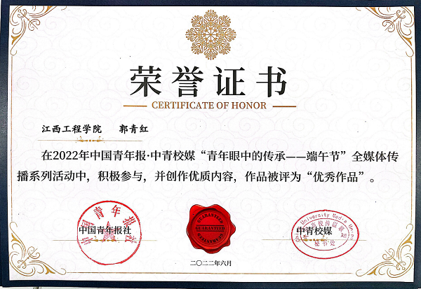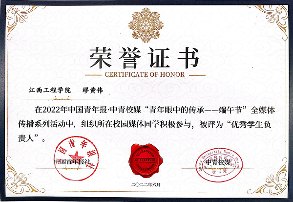 在此次活动中,beat365体育官方网站校团委小青团工作室获得“优秀组织奖”荣誉称号;缪黄伟获得“优秀学生负责人”荣誉称号;缪黄伟、曹艺菲,徐琳琳,郭青红,刘景涛五位同学参赛作品被评为“优秀作品”。