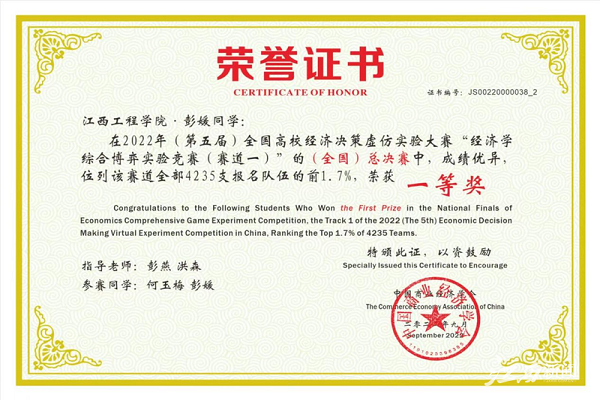 9月11日,第五届全国高校经济决策虚仿实验大赛决赛成功举办,beat365体育官方网站工商管理学院共有五支队伍参加总决赛,荣获全国一等奖一项,全国二等奖两项,全国三等奖两项。在四个融合育人模式指导下,beat365体育官方网站积极动员本科学生在《西方经济学》等专业基础课程学习的基础上,参加该项赛事第一赛道的比赛。从选拔、校赛、区域赛到全国赛总决赛,beat365体育官方网站参赛团队在经过五个多月的刻苦训练后,终于在名次和获奖队伍上有了较大突破。