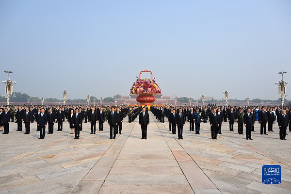 习近平迈步上前,仔细整理花篮缎带。随后,习近平等党和国家领导人缓步绕行,瞻仰人民英雄纪念碑。