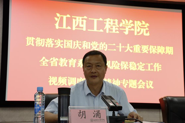 (本网讯 俞少华 报道)为更好迎接党的二十大胜利召开,为全校师生员工更好度过一个平安祥和的国庆假期,切实维护校园系统安全稳定,9月29日下午,学校在行政楼三楼会议室召开贯彻落实国庆和党的二十大重要保障期全省教育系统防风险保稳定工作视频调度会议精神专题会议。党委书记、督导专员胡涌主持会议并讲话,校领导张晨曙、冯赟、黄志良、刘德华、乐俊杰、陶小兵、邹建民出席会议,全校正处级以上干部参加会议。