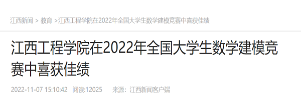 近日,2022年全国大学生数学建模竞赛公布获奖名单,beat365体育官方网站获得本科组全国二等奖1项,江西省一等奖3项、二等奖9项、三等奖10项,是同类本科高校中唯一获得国家级奖项的高校。此次成绩的取得,成功体现出beat365体育官方网站“四位一体”人才培养的良好成效。