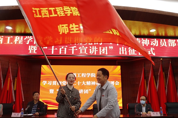 党委副书记、校长张晨曙为“十百千宣讲团”宣讲团代表授旗