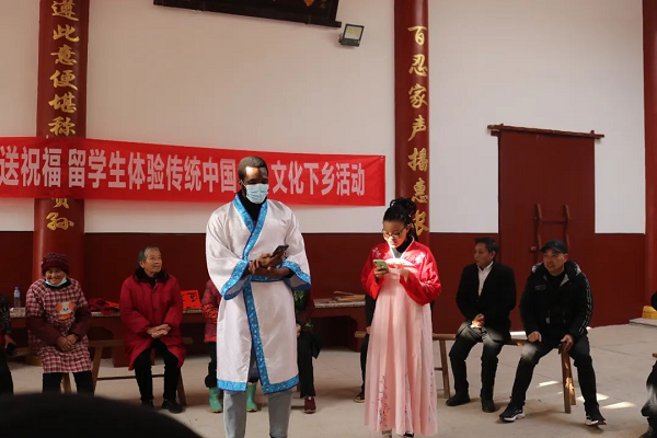 志愿者师生于永清、于兴远演奏了葫芦丝《有一个美丽的地方》和二胡《赛马曲》《战马奔腾》,村民们听得如痴如醉,掌声和叫好声接连不断。随后,外国留学生们又为大家献上一场中文朗诵,将全场气氛推向高潮。大家欢声笑语、齐聚一堂,共同庆祝即将到来的春节。