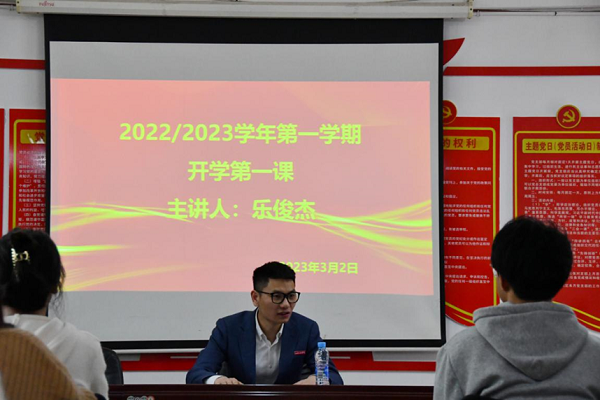 2023年3月2日,校党委委员、董事长助理、校长助理乐俊杰围绕学校疫情防控,社会经济发展,校园常态化管理工作等内容,在教学楼B401会议室为会计金融学院学生讲授“开学第一课”。