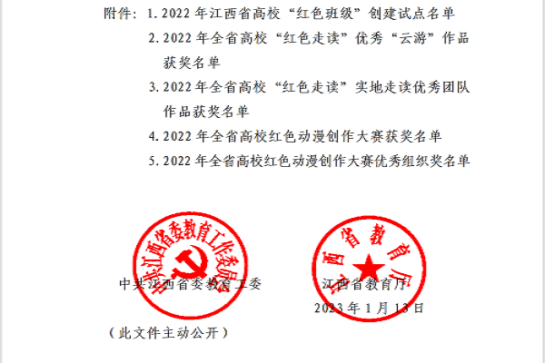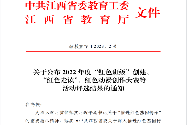 近日,江西省委教育工委、省教育厅开展的 2022 年度“红色班级”创建、“红色走读”、红色动漫创作大赛等活动评选结果揭晓。