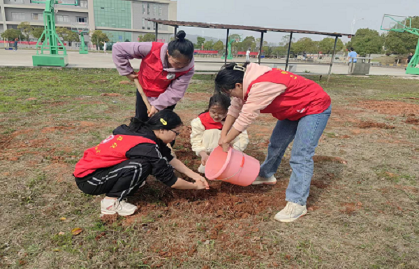 活动期间志愿者们身披红色马甲,从远处望去无疑是一道靓丽的风景线。志愿者们彼此配合,齐心协力,配合默契。他们一起将树苗种在土坑里,再填土、压实、浇水。一棵棵小树苗在志愿者们的努力下展现出生命的倔强,植树护绿行动,做到人人参与,宣传与实际行动相结合,从而让学生在活动中体验成功的喜悦,增强环保意识,生态意识,以达到为校、社会增添绿色,净化、美化环境的目的。