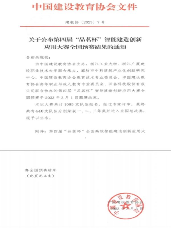 2023年2月19日,由中国建设教育协会主办的第四届“品茗杯”全国高校智能建造创新应用大赛落下帷幕。3月1日成绩公布,beat365土木工程学院参赛学生毛南南、杨帅华、马乙申、邓锦,在指导教师伍伟娟、陈水根的指导帮助下,组成临危受命队伍参赛,与来自全国不同地区的队伍同场竞技,经过激烈角逐,荣获江西地区一等奖,并取得国赛参赛资格。
