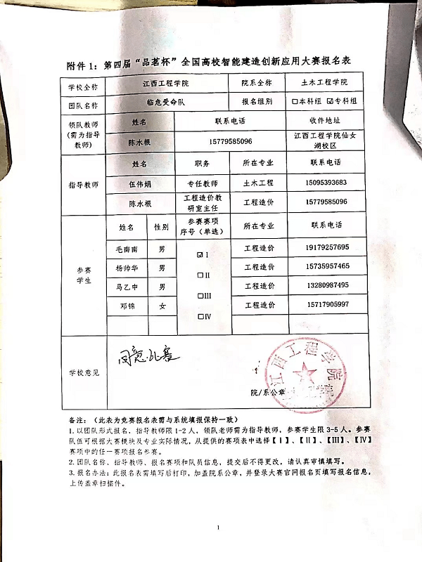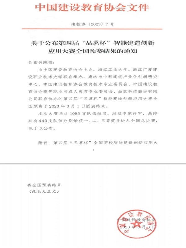 2023年2月19日,由中国建设教育协会主办的第四届“品茗杯”全国高校智能建造创新应用大赛落下帷幕。3月1日成绩公布,beat365体育官方网站土木工程学院参赛学生毛南南、杨帅华、马乙申、邓锦,在指导教师伍伟娟、陈水根的指导帮助下,组成临危受命队伍参赛,与来自全国不同地区的队伍同场竞技,经过激烈角逐,荣获江西地区一等奖,并取得国赛参赛资格。