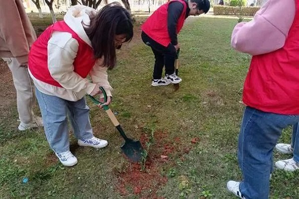 在植树活动现场,党总支书记范向红带领志愿者们拿着树苗、提着水桶、带上锄头、铲子等工具,发挥不怕苦、不怕脏的精神来到植树指定点,志愿者们身穿红色马甲,迅速投入到植树行动中。大家分工协作,你挖坑我填土,一棵棵小树种下,不仅仅饱含着同学们的热情,更是对绿色环保、植树造林理念的倡导,他们纷纷表示,在今后的学习和生活中,将自觉维护校园美好人文环境,传播卫生环保理念。