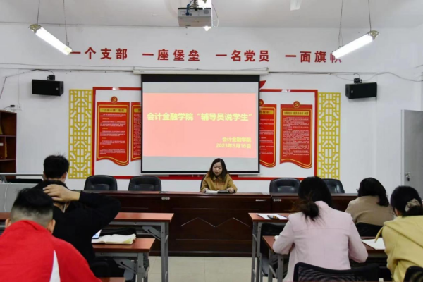 3 月 16 日,会计金融学院按照学校迎评促建“六说”活动的部署要求,于 B 栋 401 党员活动室开展“辅导员说学生”专题活动。活动由会计金融学院党总支书记沈晓娇主持,全体辅导员参与此次活动。此次活动带领大家共同学习、探讨高校本科评估对辅导员工作的要求,从而细化辅导员工作,全面迎接评估。