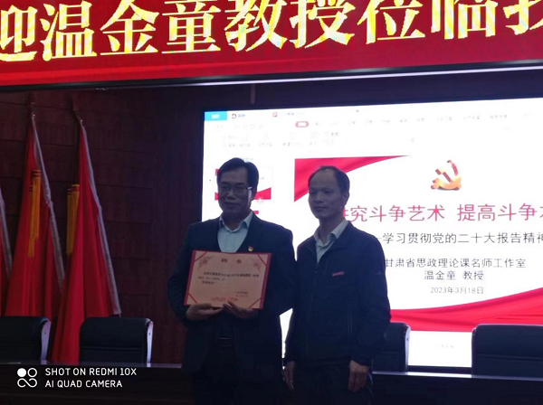 (本网讯 王为兴 报道)为深入学习宣传贯彻党的二十大精神,3月18日下午,中国人民大学博士、甘肃农业大学硕士生导师温金童教授受邀来beat365文科楼一楼学术报告厅作以《讲究斗争艺术 提高斗争本领——学习贯彻党的二十大报告精神》为题的专题讲座,马克思主义学院的全体教师、抱石艺术学院部分师生代表参加会议,讲座由beat365马克思主义学院副院长胡延庆主持。