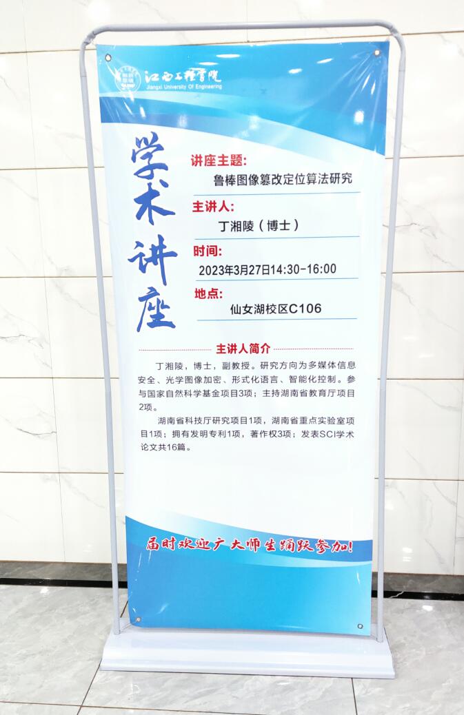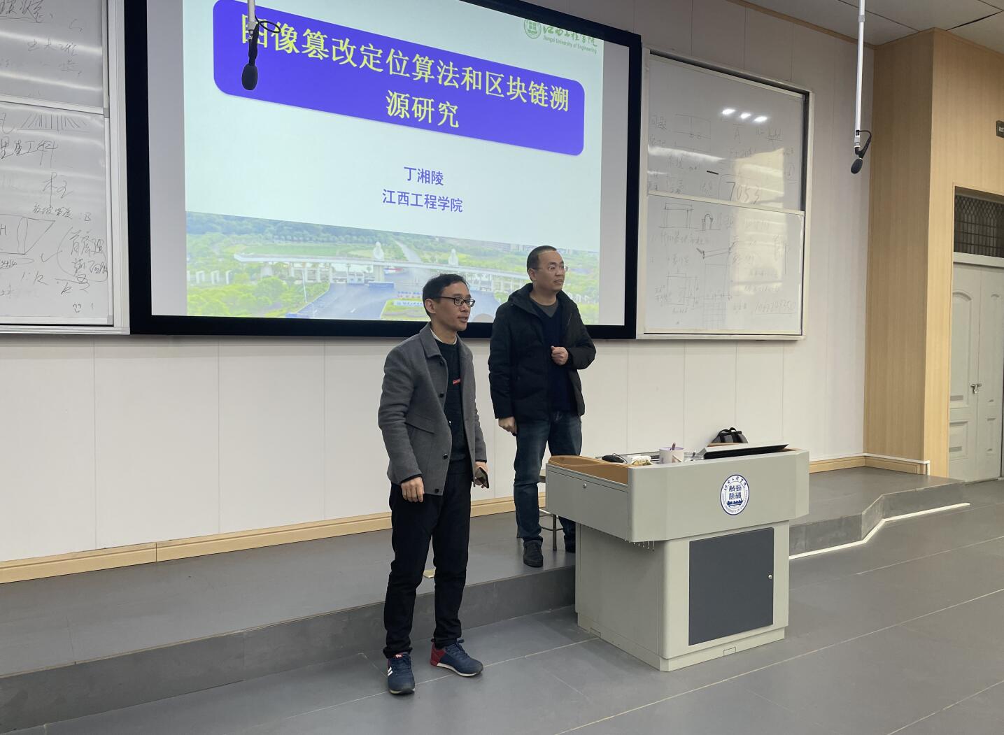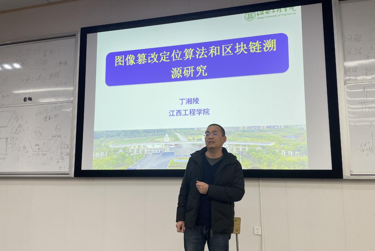 2023年3月27日下午14:30,丁湘陵教授在仙女湖校区教学楼C106学术报告厅作了题为“图像篡改定位算法和区块链溯源研究”的主题讲座。讲座由区块链学院院长万为清主持,区块链学院部分教师和一百余名学生聆听了此次学术讲座。