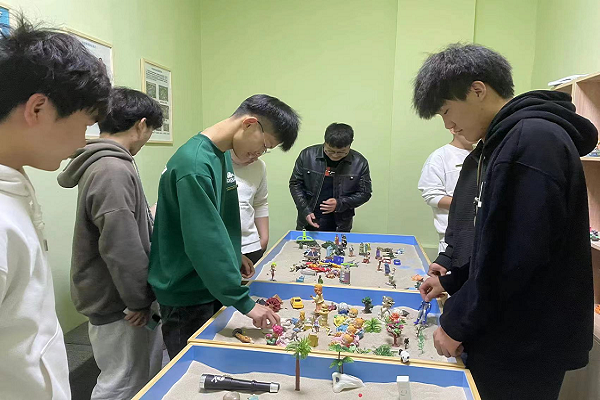 在沙盘体验室,心理健康教师带领同学们触摸沙子和沙具、观看沙盘造型,讨论交流、引导学生摆放出自己内心的沙盘世界。