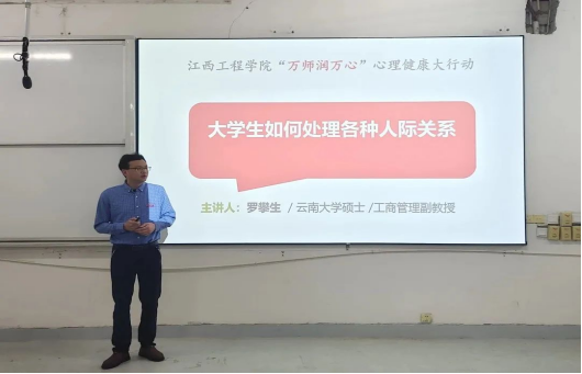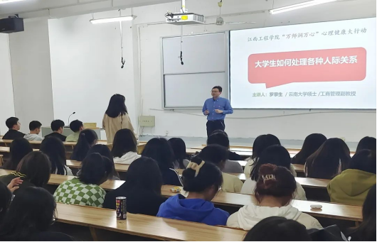 根据省教育厅《关于印发(全省高校“万师润万心”心理健康大行动实施方案)的通知》和beat365《关于beat365体育官方网站“万师润万心”心理健康大行动的实施方案的通知》精神。4月11日下午14:30-16:30,beat365体育官方网站天工校区数字贸易B106多媒体教室开展了由江西省“万师润万心”心理健康大行动讲师团成员、数字贸易学院实验室中心副主任、副教授罗攀生以《大学生如何处理各种人际关系》为主题的江西省高校“万师润万心”心理健康教育大行动系列活动之护万生专题讲座。数字贸易学院300余名学生参加本次讲座。