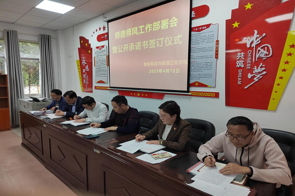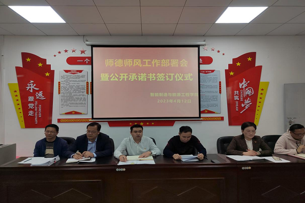 为进一步加强学院师德师风建设,持续提升教师思想认识,规范教师育人行为,强化教师文明从教,2023年4月12日,智能制造与能源工程学院在仙女湖校区B栋104会议室召开师德师风工作部署会暨公开承诺书签订仪式,此次会议由学院院长史洪松主持,党总支书记范向红,党总支副书记刘艳华,副院长彭秋梅以及全体教师参此了此次会议。