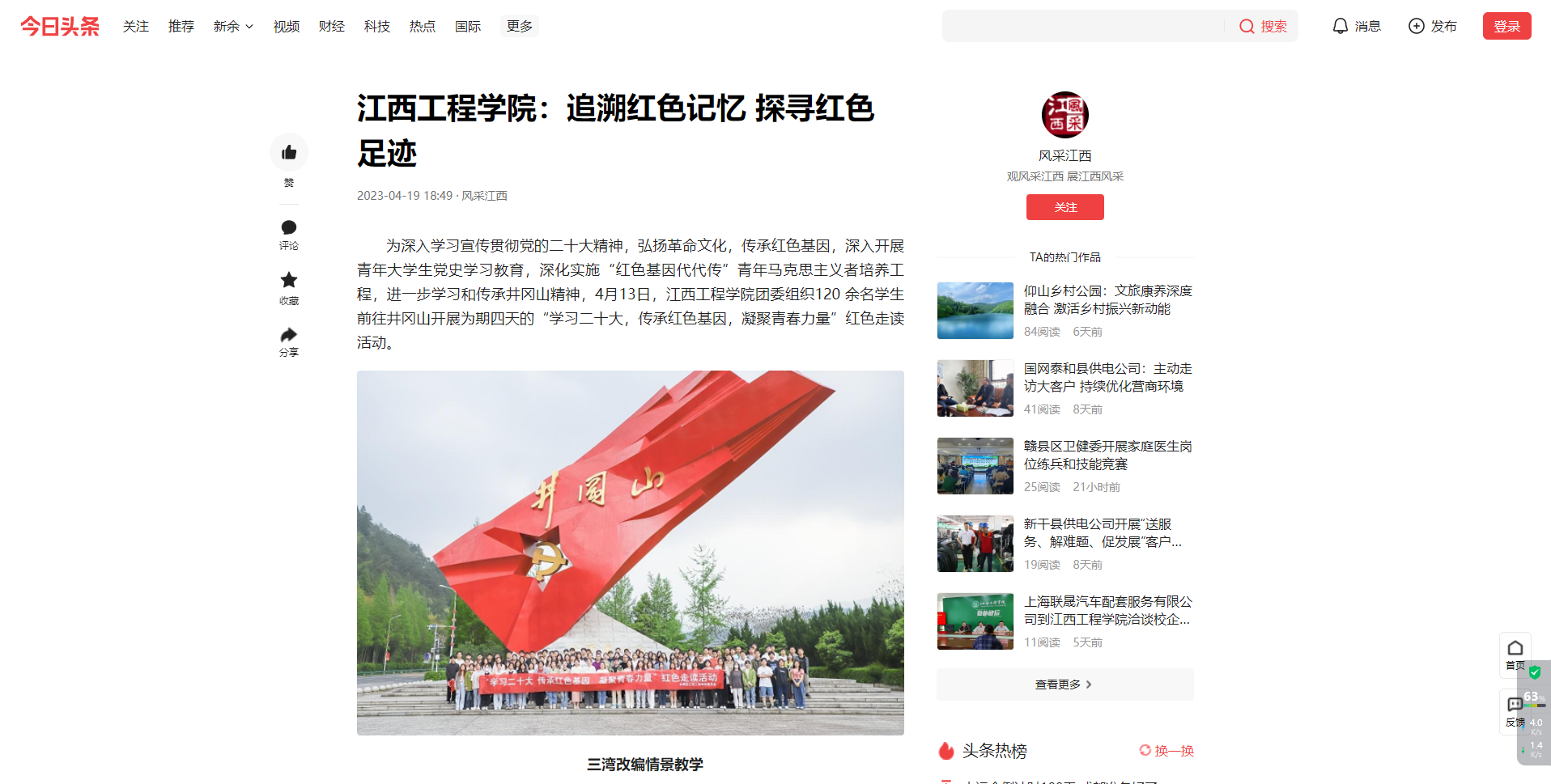 为深入学习宣传贯彻党的二十大精神,弘扬革命文化,传承红色基因,深入开展青年大学生党史学习教育,深化实施“红色基因代代传”青年马克思主义者培养工程,进一步学习和传承井冈山精神,2023年4月13日beat365体育官方网站团委组织120余名学生前往井冈山开展为期四天的“学习二十大,传承红色基因,凝聚青春力量”红色走读活动。