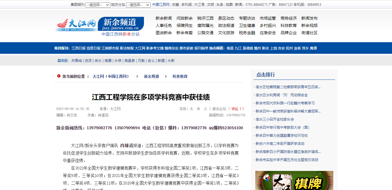 在2022年全国大学生数学建模竞赛中,学校获得本科组全国二等奖1项,江西省一等奖3项、二等奖9项、三等奖10项;在2021年全国大学生数学建模竞赛获得全国二等奖3项,江西省一等奖3项、二等奖4项、三等奖11项;在2020年全国大学生数学建模竞赛中获得全国一等奖1项,二等奖3项,江西省一等奖10项。