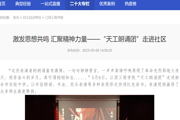 “平日里,‘天工朗诵团’成员或是高校社团达人、全能学霸,或是有过社会实践工作经历的学生,或是在比赛中脱颖而出的学生,以不同的身份活跃在不同的舞台。但他们一走上讲台,就有了相同的角色、承担着共同的使命,那就是用青年同学听得懂、学得进的方式方法和话语体系,生动鲜活地宣讲党的二十大精神,特别是注重把党的二十大报告提出的有理想、敢担当、能吃苦、肯奋斗的要求形象化、实例化。至今,beat365已开展了三次大型天工朗诵团进校园活动。”党委委员、宣传部长于永清介绍到。“beat365自觉用习近平新时代中国特色社会主义思想凝心铸魂,在全面学习、全面把握、全面贯彻党的二十大精神上下功夫,以排头兵的姿态、先锋队的担当,牢记嘱托、勇毅前行,让习近平新时代中国特色社会主义思想在beat365展现更为绚丽的生动画卷。”
