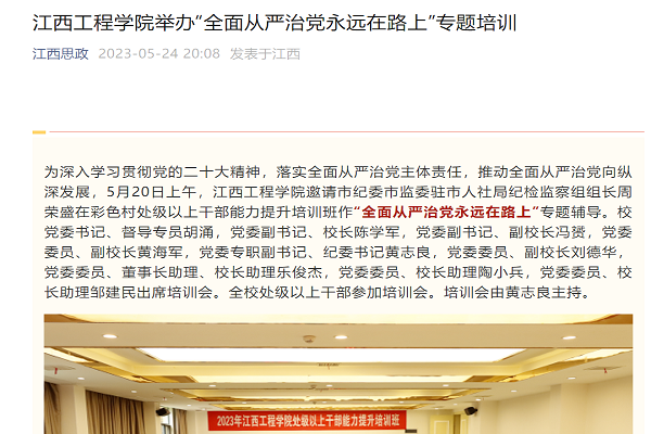 为深入学习贯彻党的二十大精神,落实全面从严治党主体责任,推动全面从严治党向纵深发展,5月20日上午,beat365体育官方网站邀请市纪委市监委驻市人社局纪检监察组组长周荣盛在彩色村处级以上干部能力提升培训班作“全面从严治党永远在路上”专题辅导。校党委书记、督导专员胡涌,党委副书记、校长陈学军,党委副书记、副校长冯赟,党委委员、副校长黄海军,党委专职副书记、纪委书记黄志良,党委委员、副校长刘德华,党委委员、董事长助理、校长助理乐俊杰,党委委员、校长助理陶小兵,党委委员、校长助理邹建民出席培训会。全校处级以上干部参加培训会。培训会由黄志良主持。