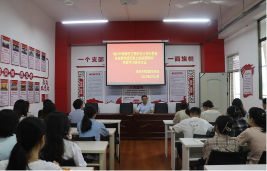 2023年5月25日,学院党总支书记范向红带领全体与会成员学习了省长叶建春同志在江西农业大学形势报告会暨专题党课上的讲话。范向红强调,作为省内高校学生,大家要志存高远、脚踏实地、勇于探索、修身律己,自觉把人生抱负同强国建设、民族复兴结合起来,把“读万卷书”与“行万里路”结合起来,为推进红色基因传承等贡献力量,在报效祖国、服务人民中书写无悔青春。
