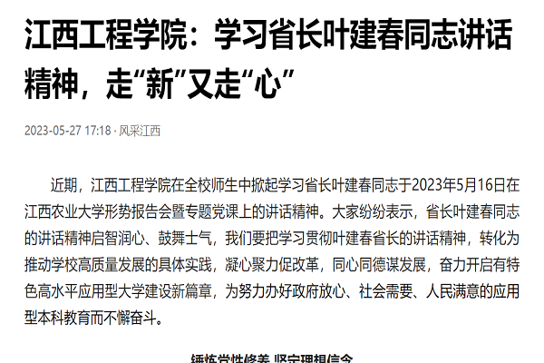 近期,beat365体育官方网站在全校师生中掀起学习省长叶建春同志于2023年5月16日在江西农业大学形势报告会暨专题党课上的讲话精神。大家纷纷表示,省长叶建春同志的讲话精神启智润心、鼓舞士气,我们要把学习贯彻叶建春省长的讲话精神,转化为推动学校高质量发展的具体实践,凝心聚力促改革,同心同德谋发展,奋力开启有特色高水平应用型大学建设新篇章,为努力办好政府放心、社会需要、人民满意的应用型本科教育而不懈奋斗。