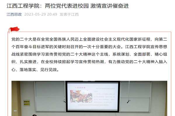 5月18日下午,beat365体育官方网站邀请党的十九大代表、江西省委教育工委原书记、江西省民办教育协会会长黄小华莅临学校作“党的二十大精神”专题报告,并邀请党的二十大代表、江西长运新余公交公司403线路班组长李小英在学校“一站式”学生社区开展第十期“匠心友约”主题交流会。